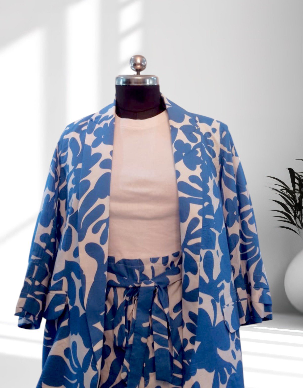 This chic co-ord set features a short jacket with 3/4 sleeves and a pair of matching shorts with a cinched waist. The vibrant blue floral pattern on a soft pink background creates a stylish and comfortable look, perfect for casual outings or vacations.