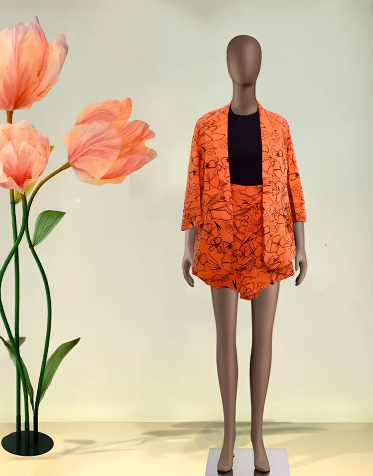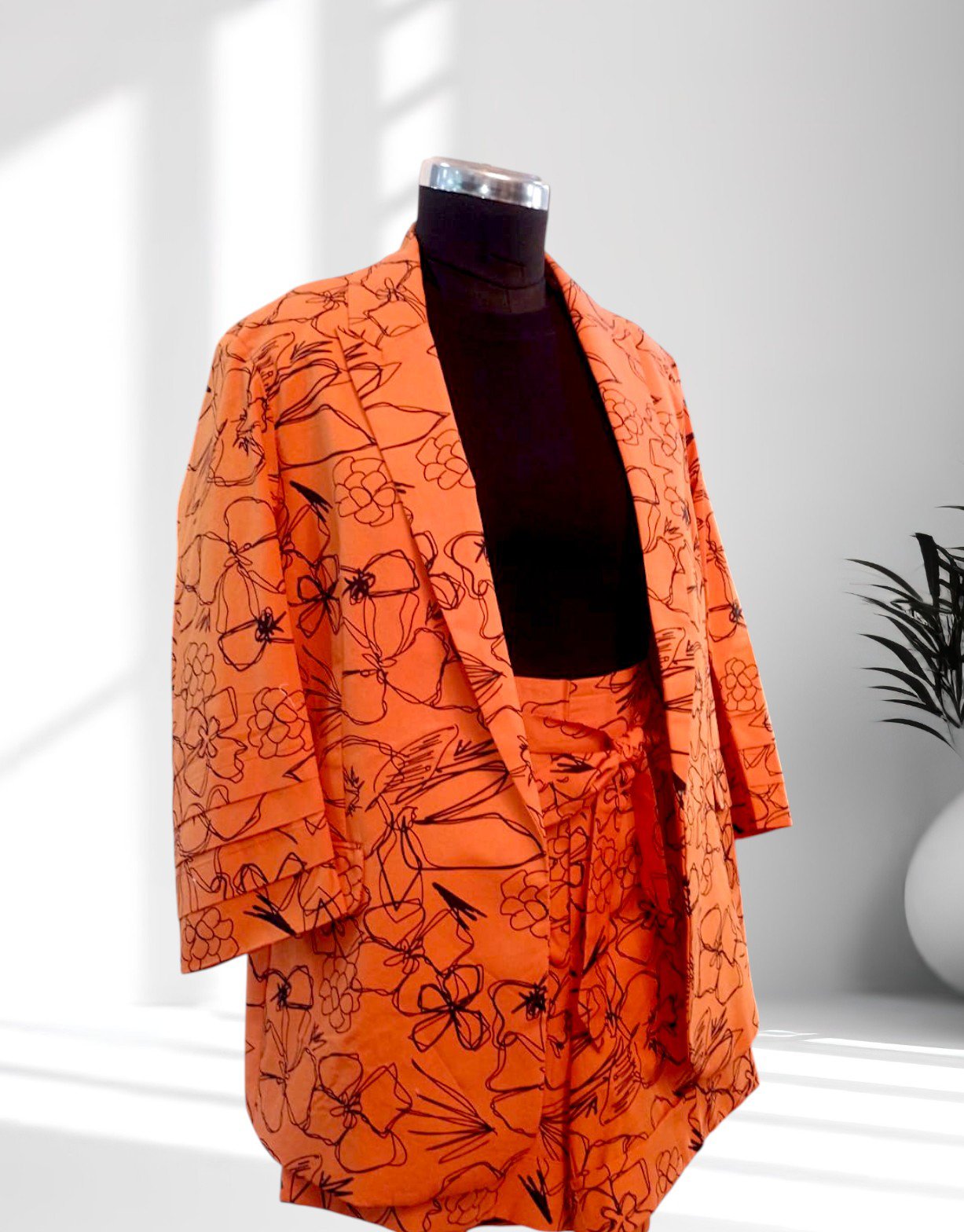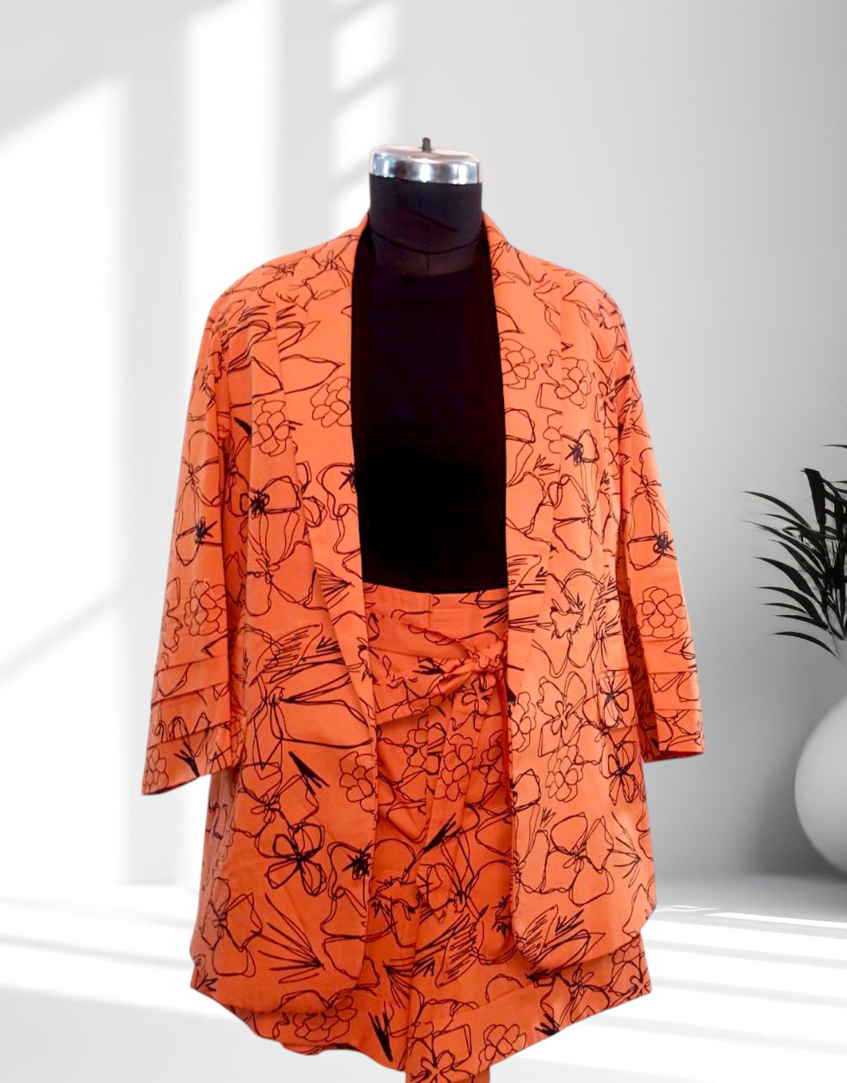 A vibrant cotton-linen blazer and high-rise shorts set with floral detailing, blending tailored structure with summer-ready ease.