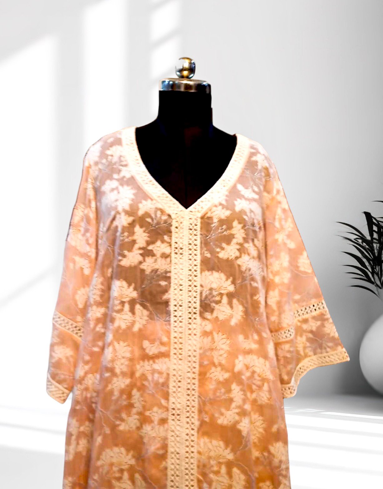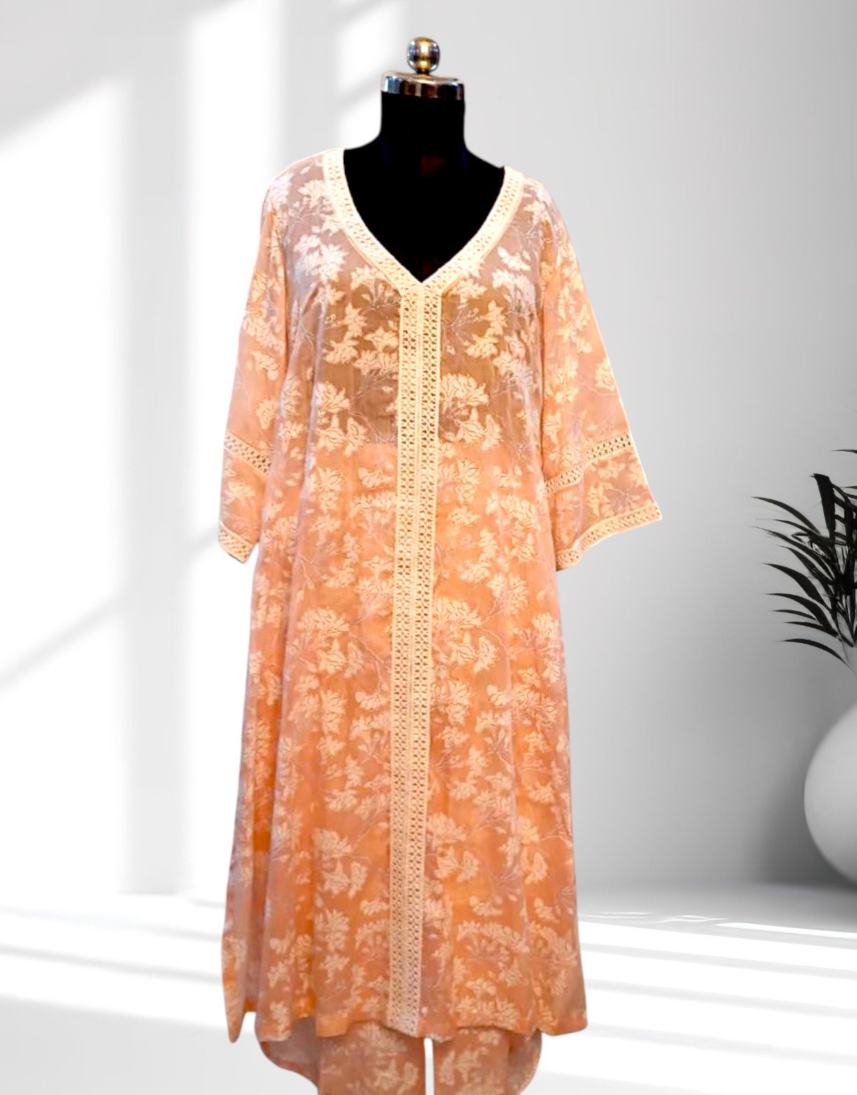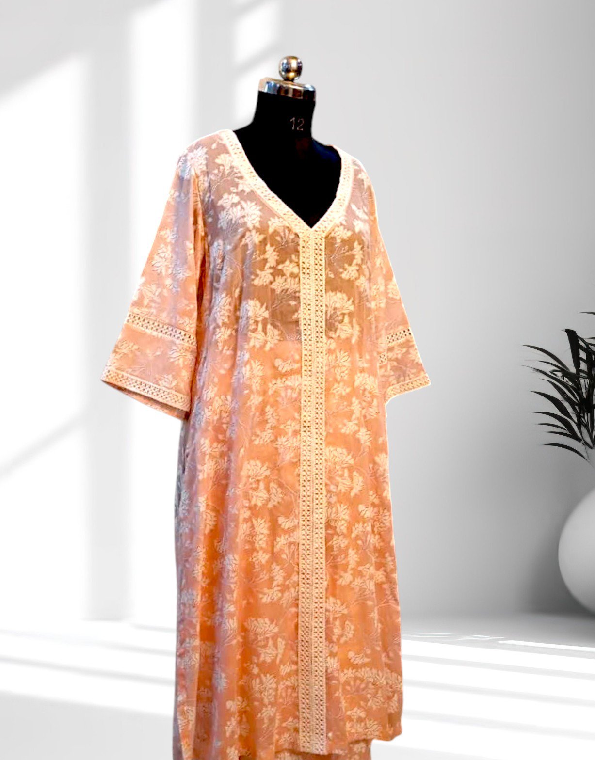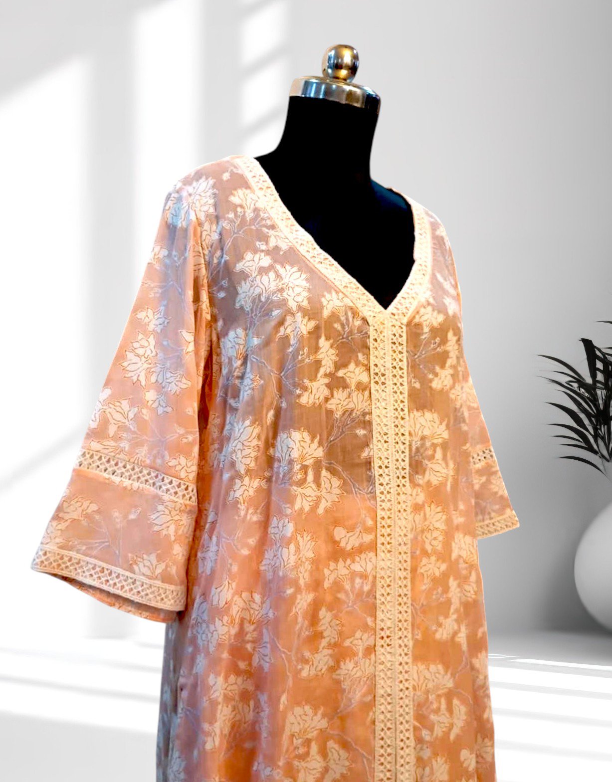 This elegant pastel pink kurta features a subtle all-over print and a relaxed V-neck fit, perfect for comfortable daily wear or loungewear.